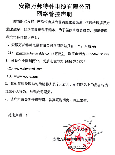 鄭重聲明:安徽萬邦特種電纜有限公司官方網站為:www_wanbangcable_com.nj4t.com,除此之外無任何子網站或合作網站,其余均為假冒偽劣。電話:0550-7621728 13485756353 地 址:安徽省天長市滁州高新技術產業開發區經四路29號